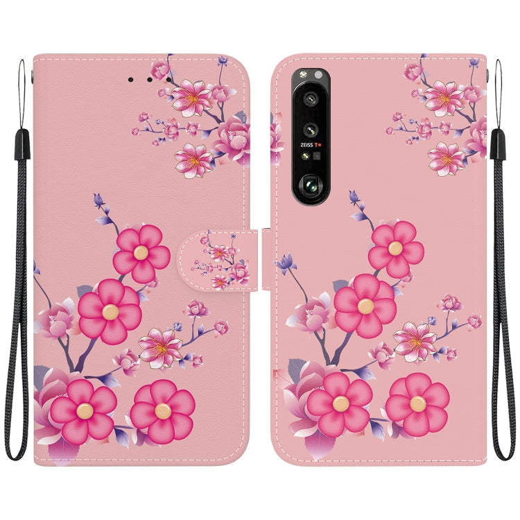 Estuche de Cuero para Sony Xperia 1 III con Dibujo Coloreado y Textura de Cristal (Flores de Cerezo)