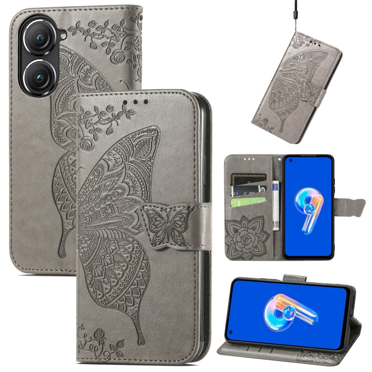 Estuche para Asus Zenfone 9 de Cuero con Tapa Horizontal en Relieve de Mariposa (Gris)