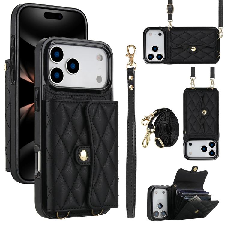 Funda de piel sintética con doble hebilla y diseño rómbico para iPhone 17 Pro (negra)