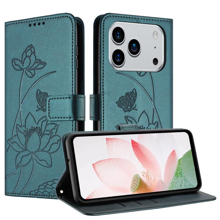Funda de piel con relieve de loto para iPhone 17 Pro con cordón (verde oscuro)