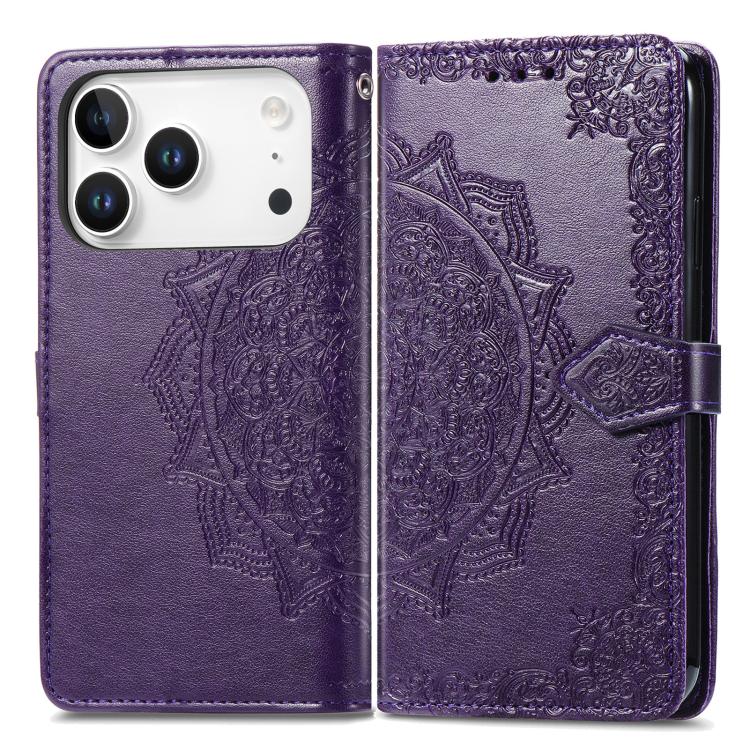 Funda de cuero con relieve de flor de mandala para iPhone 17 Pro (morada)