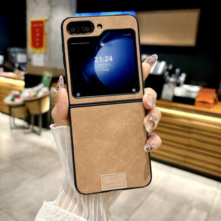Funda de piel de cordero y corcho para Samsung Galaxy Z Flip5 5G, color marrón (borde negro)