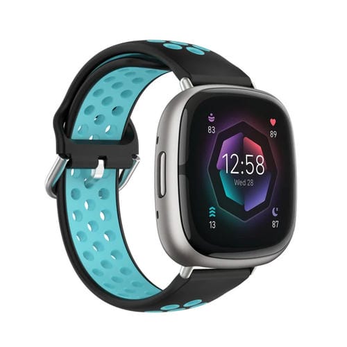Correa de Silicona para Fitbit Sense Perforada Transpirable (Negro + Verde Azulado)