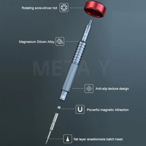 El destornillador magnético de aleación Mechanic Meta con punta Pentalobe 0,8 está diseñado específicamente para la reparación de Teléfonos Móviles, especialmente modelos de iPhone que requieren esta precisión en tornillos. Su construcción en aleación de aluminio de aviación garantiza ligereza y durabilidad, mientras que la punta tridimensional ofrece un ajuste perfecto para tornillos Pentalobe de 0,8 mm. Este destornillador es una herramienta profesional que facilita el desmontaje y montaje de componentes internos, optimizando el trabajo de usuarios que reparan por cuenta propia y técnicos especializados.