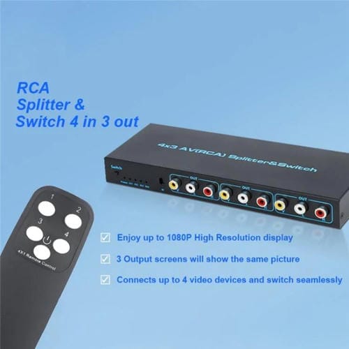 • 1x Conmutador AV Compuesto de Señal de Audio y Video RCA 4 Entradas 3 Salidas Caja Divisora Enchufe EE.UU