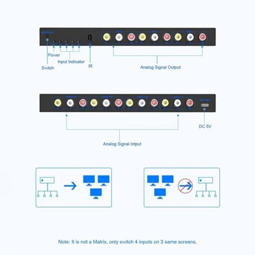 El conmutador AV compuesto de Señal de audio y video RCA con 4 entradas y 3 salidas es un dispositivo diseñado para la gestión eficiente y Flexible de múltiples fuentes audiovisuales. Compatible con Señales AV, RCA y VGA, permite conectar hasta cuatro dispositivos de entrada y distribuir la Señal a tres Pantallas simultáneamente. Su función principal es facilitar la conmutación y distribución de Señales de audio y video en sistemas de entretenimiento o profesionales, con Soporte para resoluciones de hasta 1920x1080 (Full HD) y WUXGA 1920x1440. Este conmutador incluye control remoto infrarrojo para una operación cómoda y cuenta con un diseño compacto que facilita su integración en diferentes entornos. Es compatible con relaciones de aspecto 16:9, 16:10 y 4:3, asegurando versatilidad en la Conexión de dispositivos audiovisuales diversos.