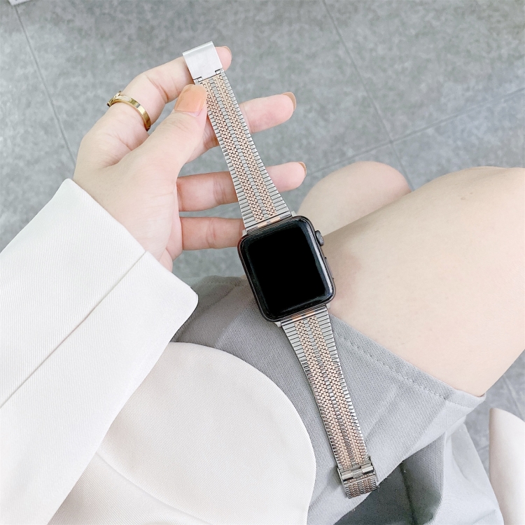 Correa de Reloj Acero Doble Línea para Apple Watch Ultra 49mm Series 8 7 45mm SE 2 6 5 4 44mm 3 2 1 42mm (Oro Rosa Plateado)