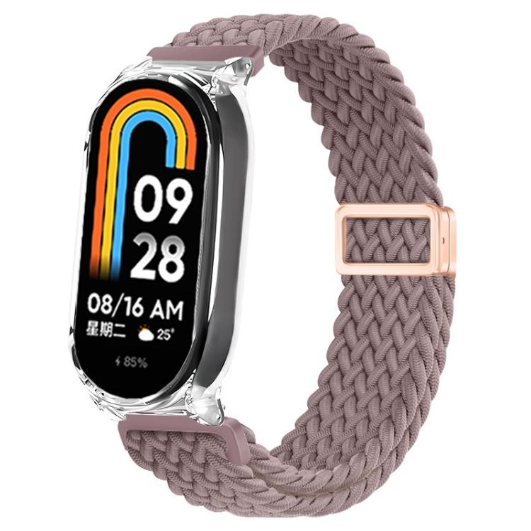 Correa de reloj elástica de nailon trenzado con hebilla magnética y marco de policarbonato transparente para Xiaomi Smart Band 9/8 (morado ahumado)