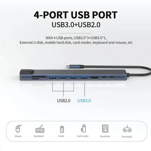 - Dimensiones: 19x3x1,1 cm; longitud del Cable: 21 cm; interfaces: 2 x Type-C, 3 x USB 2.0, 1 x USB 3.0, 1 x HDMI, 1 x Puerto de red RJ45, Lector de Tarjetas SD/TF