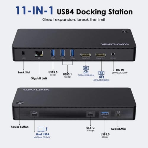 - Incluye Puertos DisplayPort 8K y 4K, Carga PD IN de 130 W, USB 3.1-C de 10 Gbps, USB 3.1-A de 10 Gbps, USB 3.0-A de 5 Gbps, Puerto Gigabit Ethernet, Conector telefónico de 4 polos y ranura para candado; transferencia de datos hasta 40 Gbps; Soporte para dos monitores 4K a 60Hz o un monitor 8K a 30Hz; Cable USB-C de 40 Gbps incluido