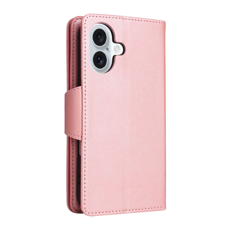 Funda de Cuero para iPhone 16 Plus con Tres Pliegues Hebilla y 9 Tarjetas (Oro Rosa)