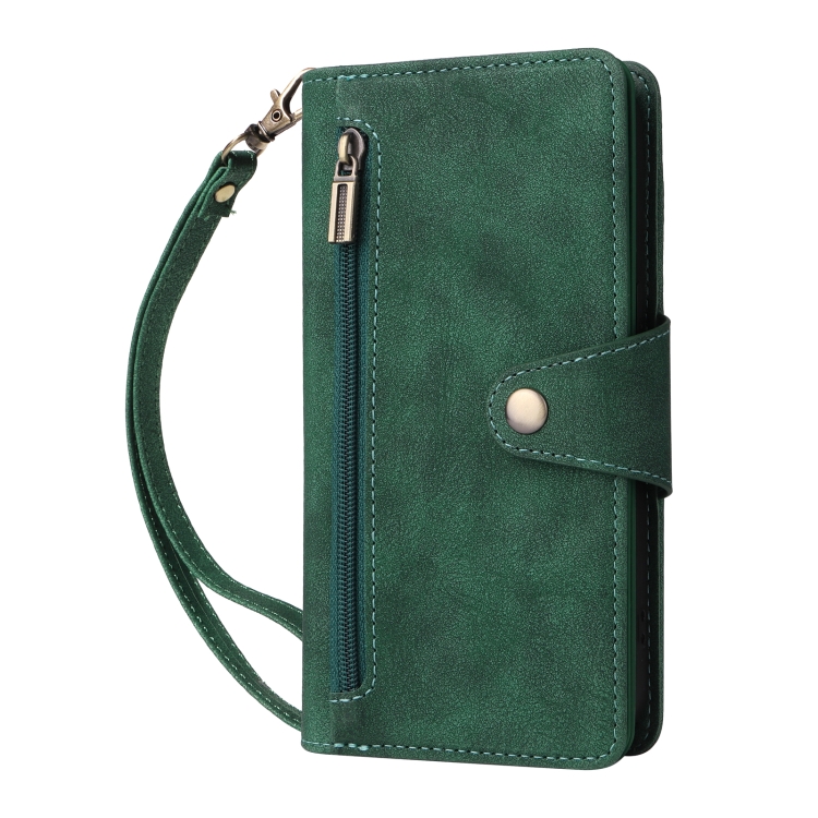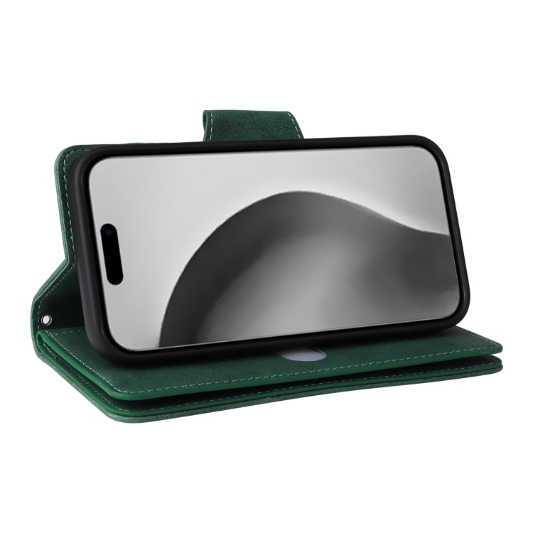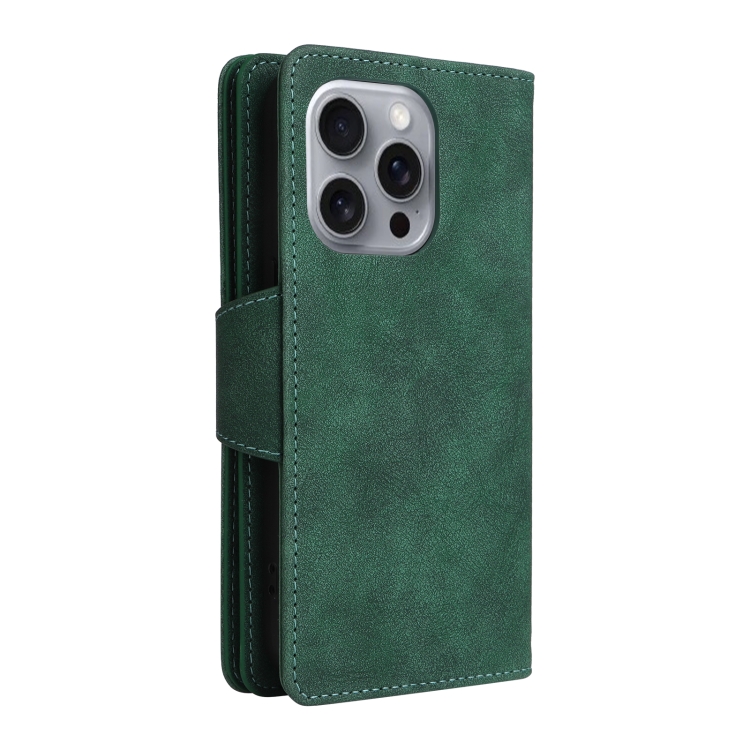 Funda de Cuero para iPhone 16 Pro Max con Tres Pliegues y Hebilla de Remache (Verde)