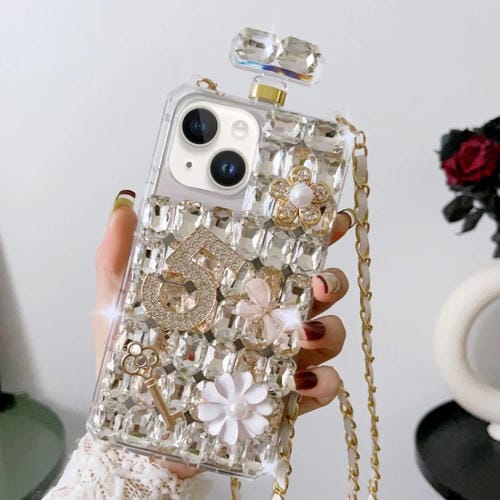 Estuche para Teléfono PC con Diamantes Hecho a Mano y Frasco de Perfume Tipo Bandolera para iPhone 14 (Blanco)