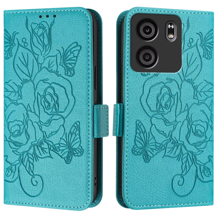 Funda de Cuero Antirrobo RFID para BLU View 5 con Diseño de Rosa en Relieve (Azul Claro)
