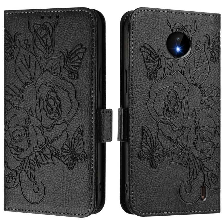 Funda de Cuero Antirrobo RFID con Relieve en Rosa para Nokia C10/C20 (Negra)