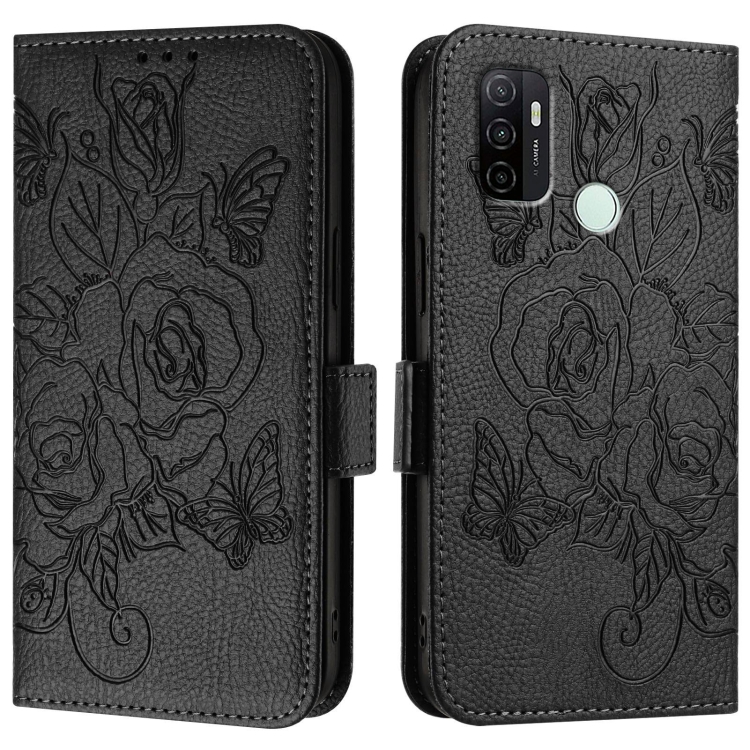 Funda de Cuero Antirrobo Rfid con Relieve En Rosa para Oppo A11S 4G (Negra)