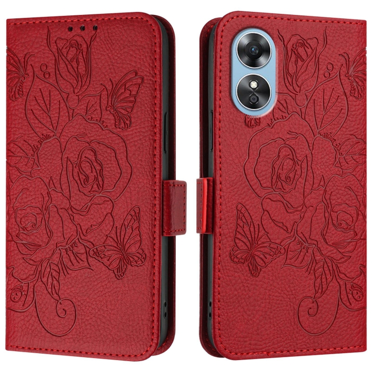 Funda de Cuero Antirrobo Rfid con Relieve En Rosa para Oppo A17 4G Global/A17K (Roja)
