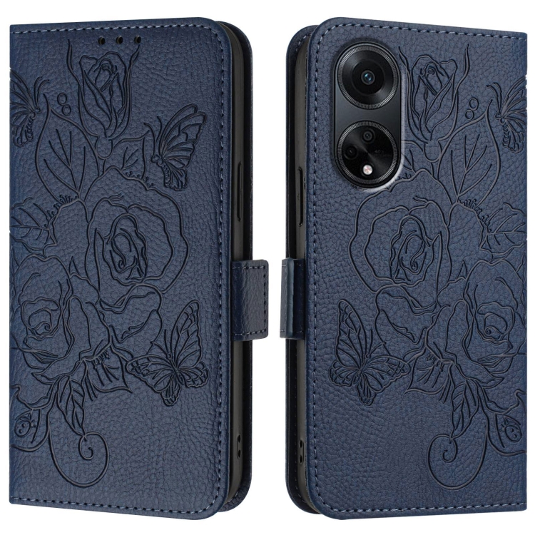 Funda de Cuero Antirrobo Rfid con Relieve En Rosa para Oppo A98 5G/F23 5G (Azul Oscuro)