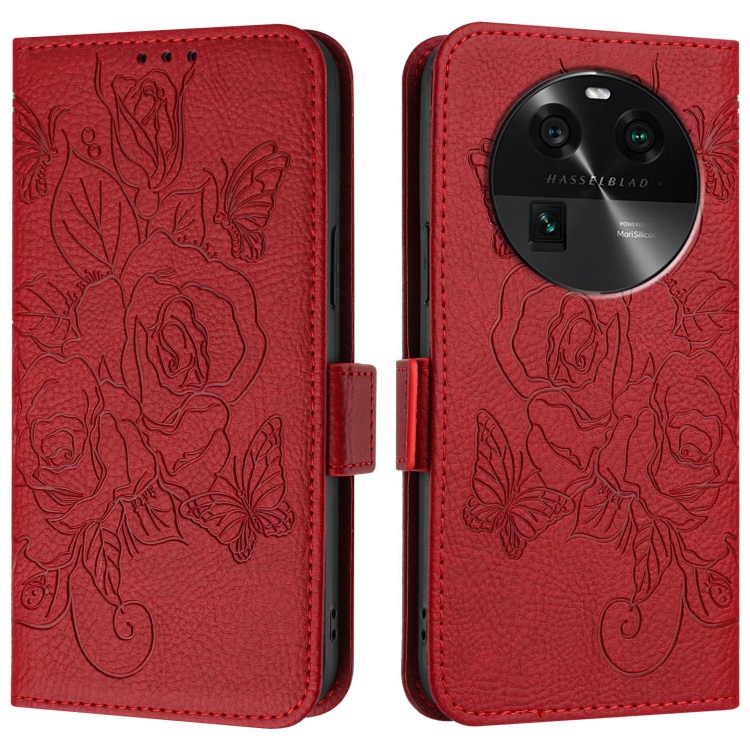 Funda de Cuero Antirrobo Rfid con Relieve En Rosa para Oppo Find X6 (Rojo)