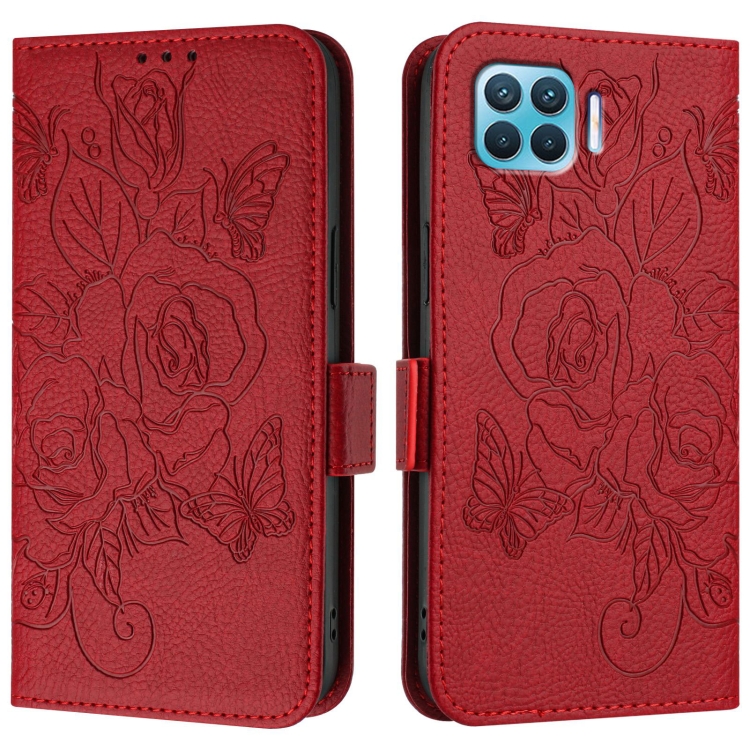 Funda de Cuero Antirrobo Rfid con Relieve En Rosa para Oppo Reno4 Lite/Reno4 F (Roja)