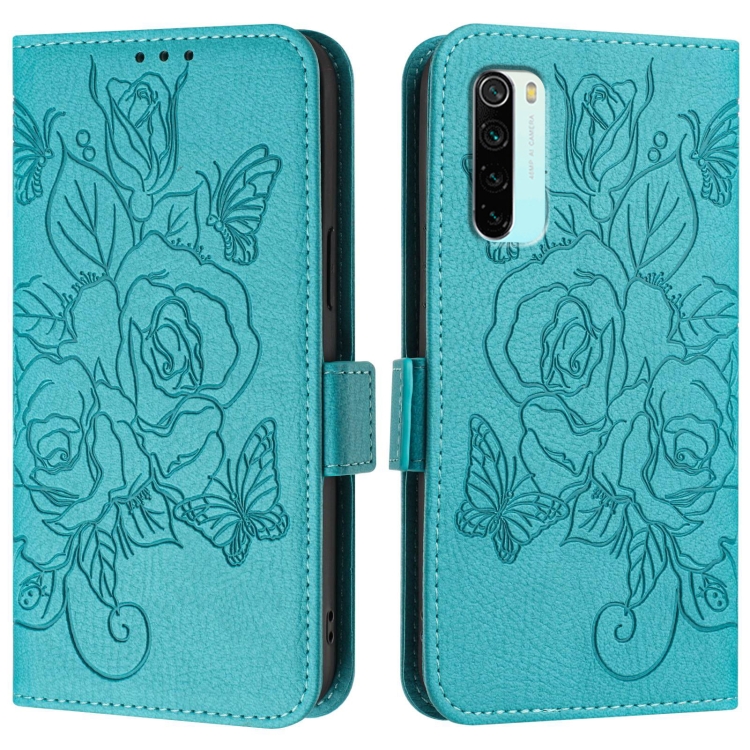 Funda de Cuero Antirrobo Rfid con Relieve En Rosa para Redmi Note 8 (Azul Claro)
