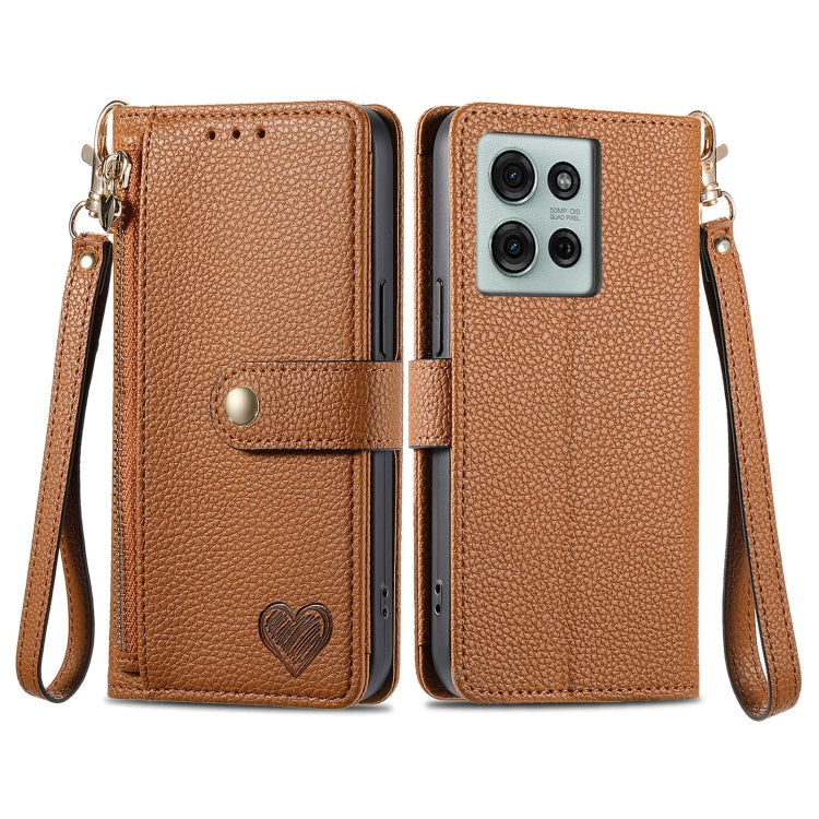 Funda de Cuero con Cordón y Cremallera Love para Motorola Moto G75 5G (Marrón)