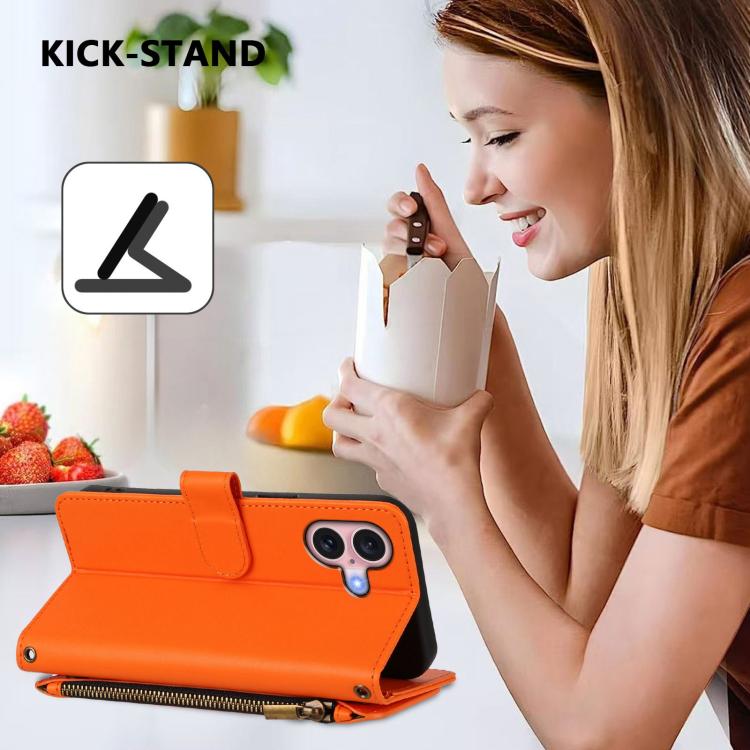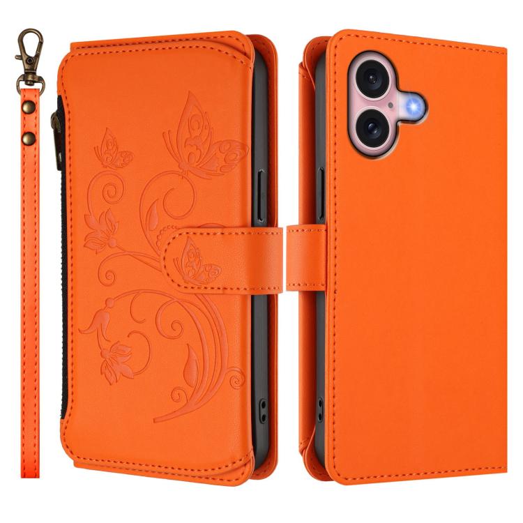 Funda de cuero con cremallera para iPhone 16, diseño de mariposas, flores y amor (naranja)