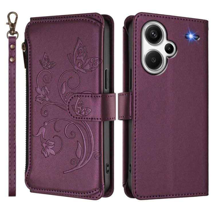 Funda de cuero con cremallera para Redmi Note 13 Pro+, diseño de mariposas, flores y mariposas (morado oscuro)