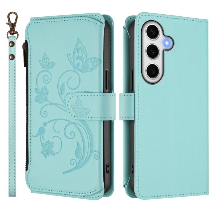Funda de cuero con cremallera para Samsung Galaxy S24 FE 5G, diseño de mariposas, flores y amor, con múltiples tarjetas (verde menta)