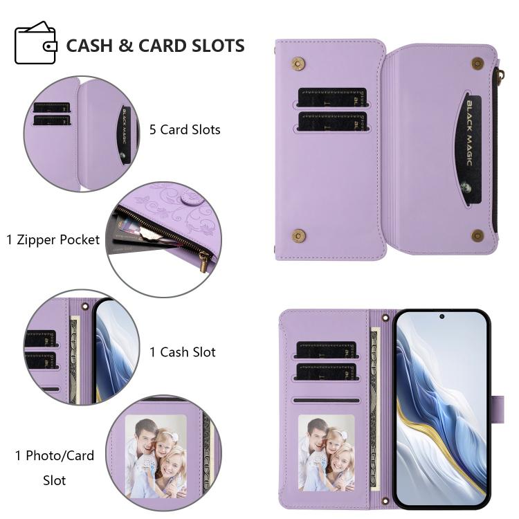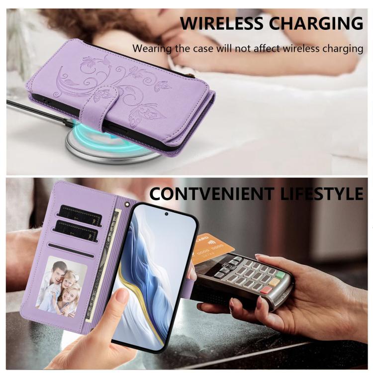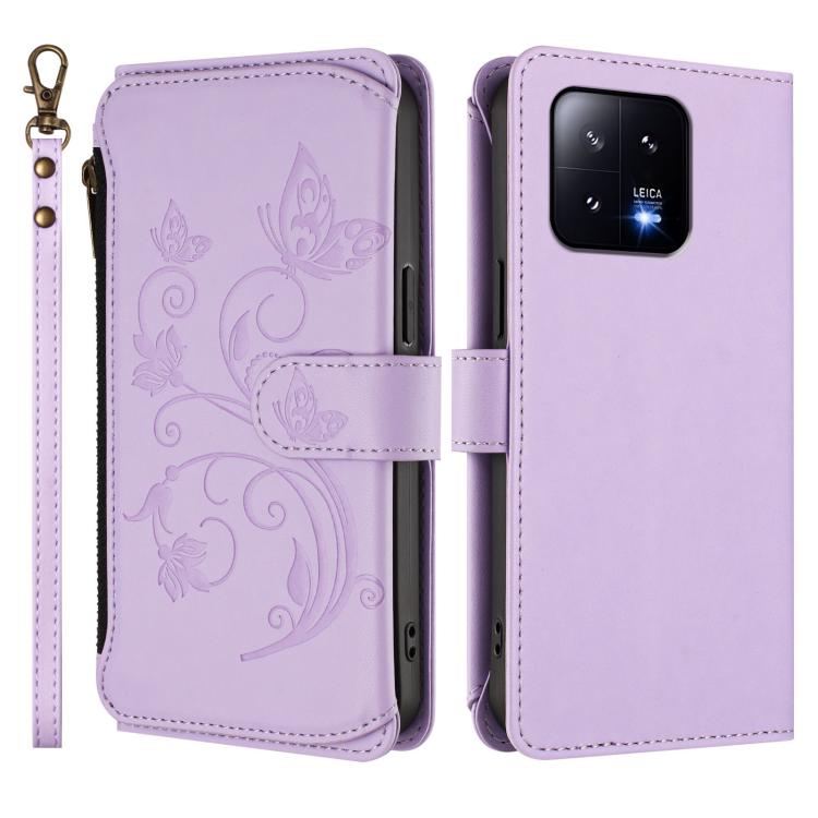 Funda de cuero con cremallera para Xiaomi 13, diseño de mariposas y flores, con múltiples tarjetas (morado claro)