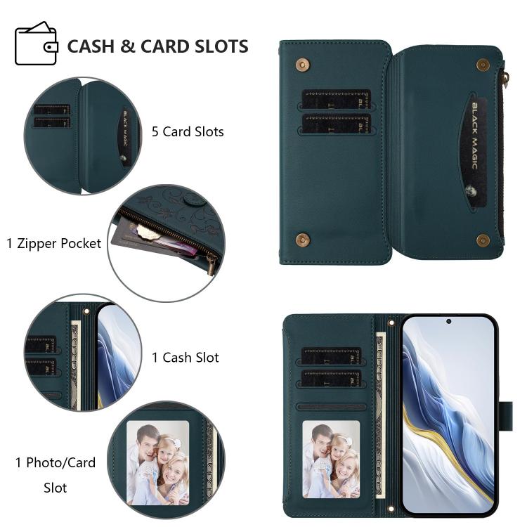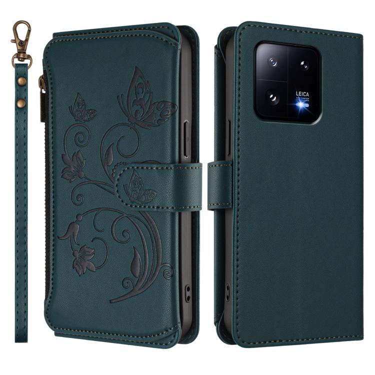 Funda de cuero con cremallera para Xiaomi 13 Pro, diseño de mariposas, flores y mariposas (verde oscuro)