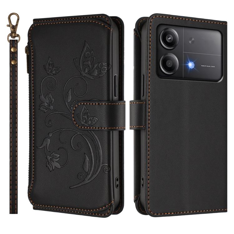 Funda de cuero con cremallera para Xiaomi Poco X6 Neo, diseño de mariposas, flores y múltiples tarjetas (negro)