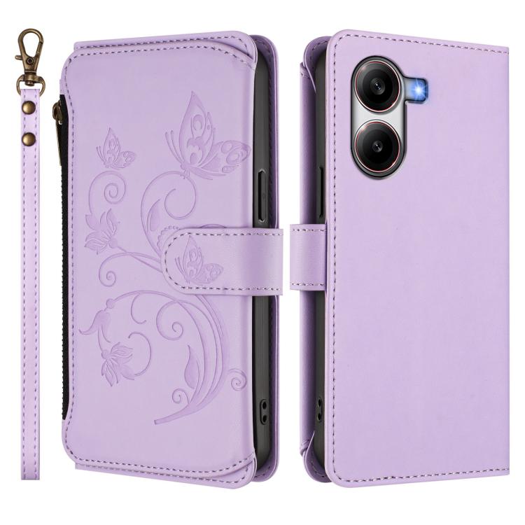 Funda de cuero con cremallera para Xiaomi Poco X7 Pro, diseño de mariposas, flores y múltiples tarjetas (morado claro)