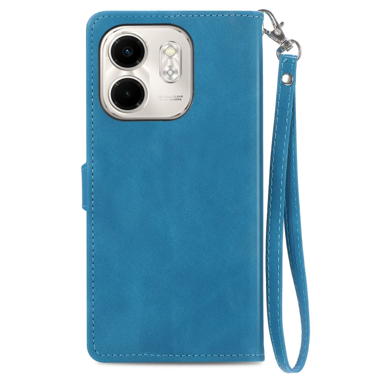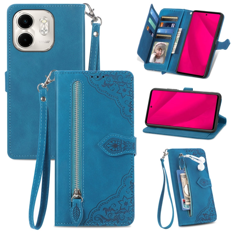 Funda de Cuero con Cremallera y Flores en Relieve para Infinix Smart 9 (Azul)