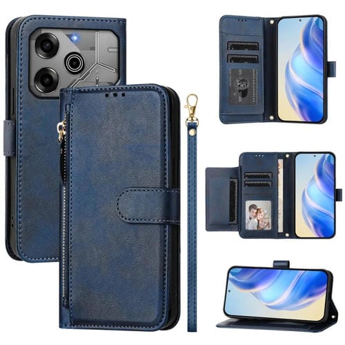 Funda de Cuero para Tecno Spark Go 2021 con Cremallera y Ranuras para Tarjetas (Azul)
