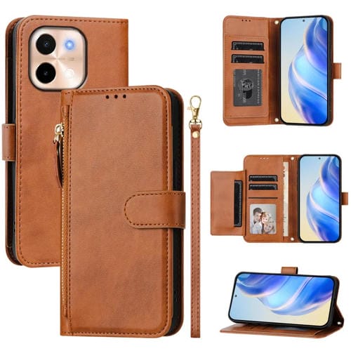Funda de Cuero con Cremallera y Ranuras para Varias Tarjetas para Vivo Y28 4G (Marrón)