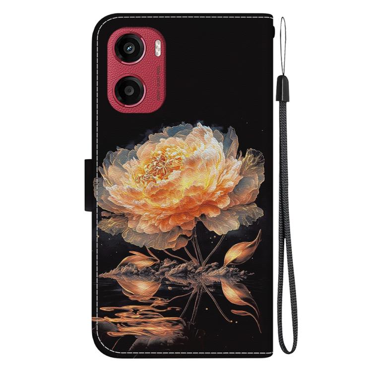 Funda de Cuero Motorola Moto G05/E15 con Dibujo de Colores y Textura de Cristal (Peonía Dorada)