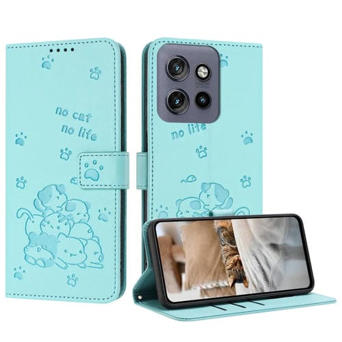Funda de Cuero Motorola Moto S50 Edge 50 Neo con Diseño de Gatito en Relieve y Cordón (Verde Menta)
