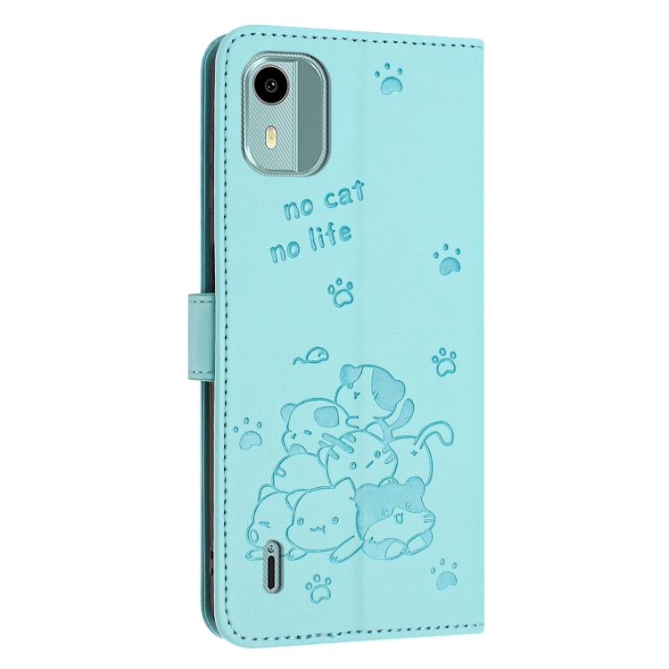 Funda de Cuero para Nokia C12 con Diseño de Gatito en Relieve y Cordón (Verde Menta)