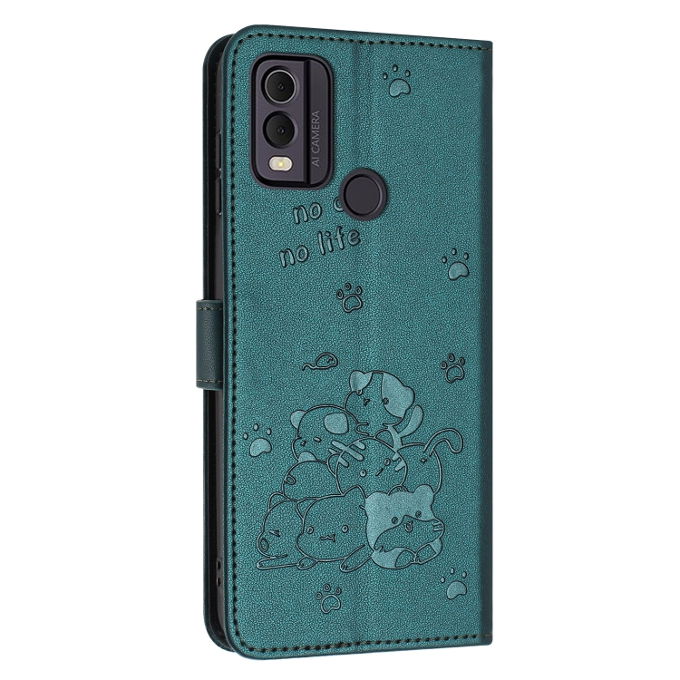 Funda de Cuero para Nokia C22 con Diseño de Gatito En Relieve y Cordón (Verde Oscuro)