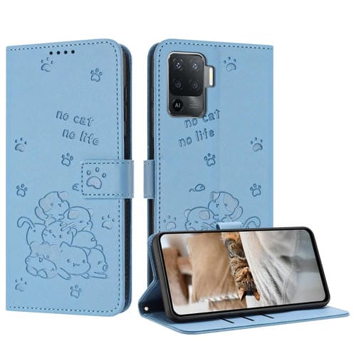 Funda de Piel con Diseño de Gatito En Relieve y Cordón para Oppo A94 4G / F19 Pro (Azul)