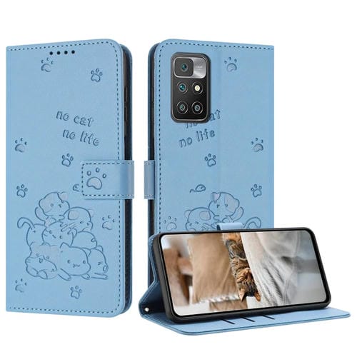 Funda de Piel con Diseño de Gatito En Relieve y Cordón para Redmi 10/10 Prime (Azul)