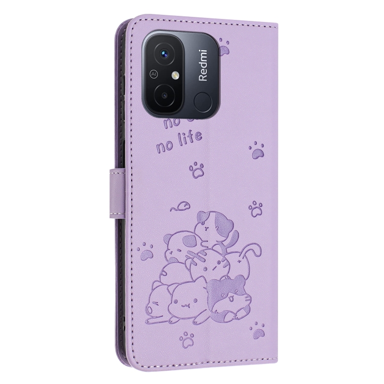Funda de Piel con Diseño de Gatito En Relieve para Redmi 11A 4G Global con Cordón (Morado)