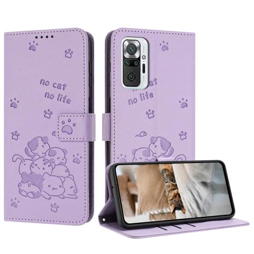 Funda de Piel con Diseño de Gatito En Relieve para Redmi Note 10 Pro con Cordón (Morado)