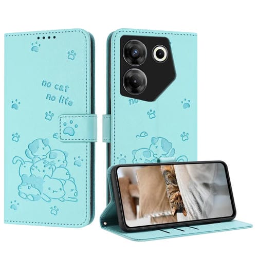 Funda de Cuero para Tecno Camon 20 Pro 5G con Diseño de Gatito en Relieve y Cordón (Verde Menta)