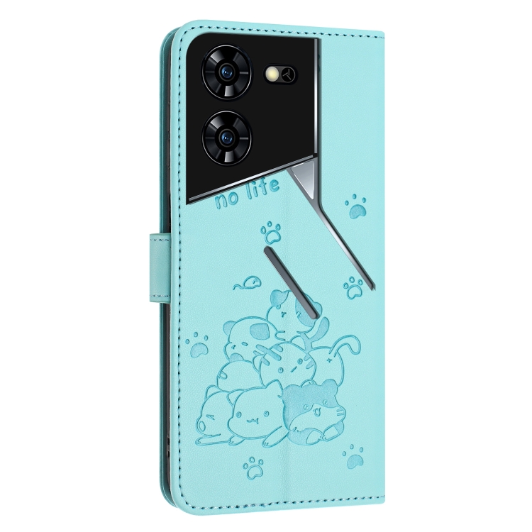 Funda de Cuero para Tecno Pova 5 Pro con Diseño de Gatito en Relieve y Cordón (Verde Menta)