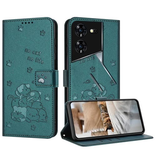 Funda de Cuero para Tecno Pova 5 Pro con Diseño de Gatito en Relieve y Cordón (Verde Oscuro)