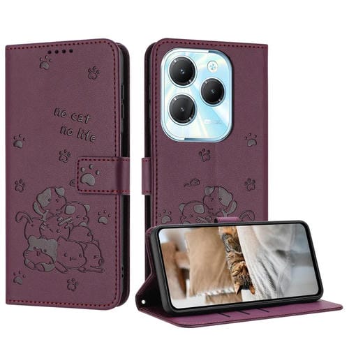 Funda de Cuero Infinix Hot 40 4G y 40 Pro 4G con Diseño de Gatito en Relieve y Cordón (Rojo Vino)