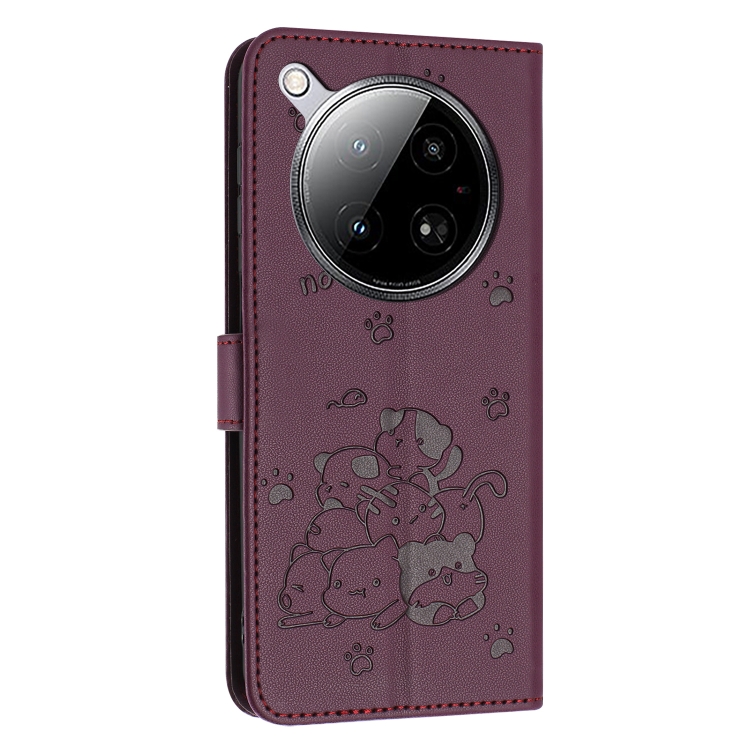 Funda de Cuero Infinix Zero 40 4G/5G con Diseño de Gatito y Cordón (Rojo Vino)