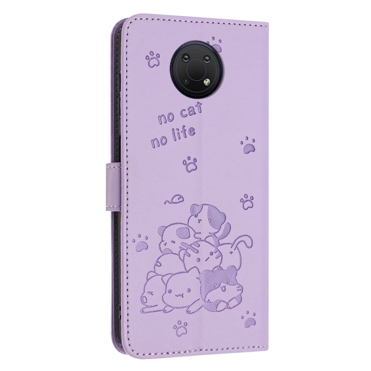 Funda de Cuero para Nokia G10/G20/G300 con Diseño de Gatito en Relieve y Cordón (Morado)